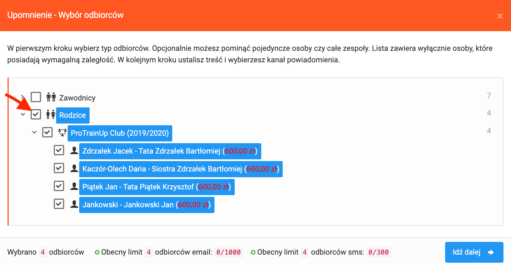 Як уже зазначалося, другим варіантом надсилання сповіщень про відставання є використання модуля масових повідомлень. Щоб скористатися цією опцією, введіть список внесків, а потім введіть конкретний внесок. Під таблицею в нижньому лівому куті екрана ви знайдете синю кнопку "відправити нагадування про оплату". Після натискання з’явиться вікно з одержувачами.